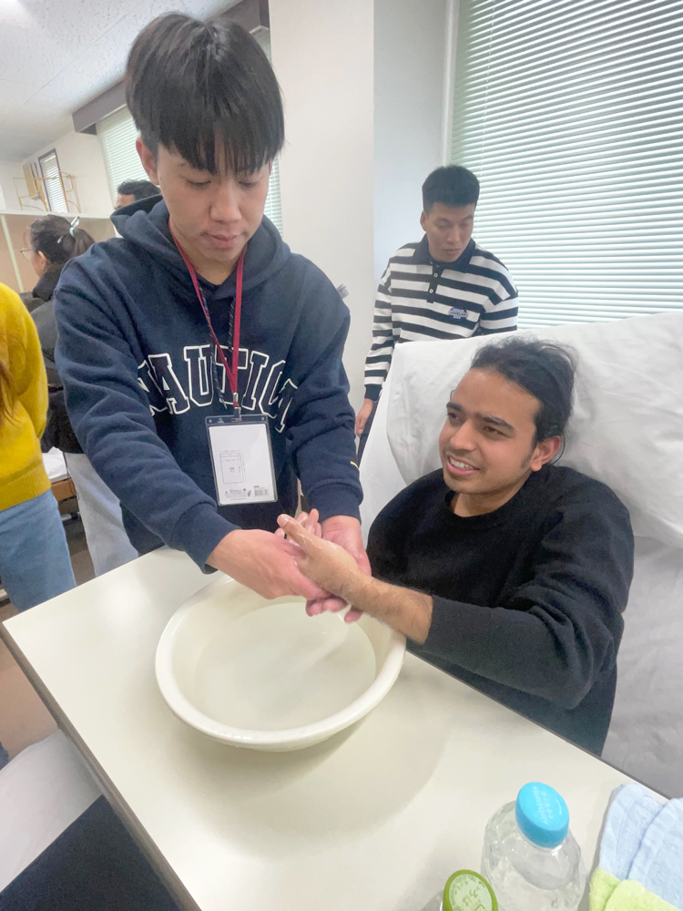 交流ではゲームやグループ活動で和やかな雰囲気となり、実習室では介護技術を体験して日本の介護現場への理解を深めました。