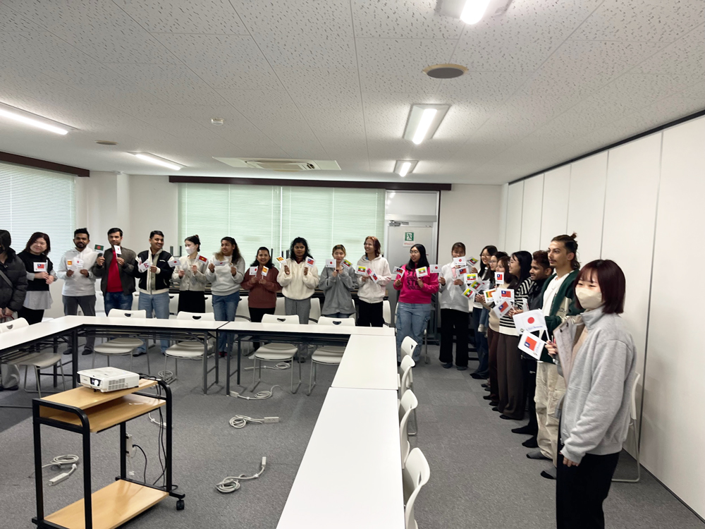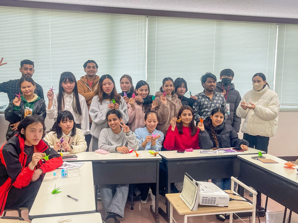 歓迎セレモニーでは日本語での自己紹介や施設見学を行い、日本語授業では折り鶴づくりや会話練習を通して交流を深めました。