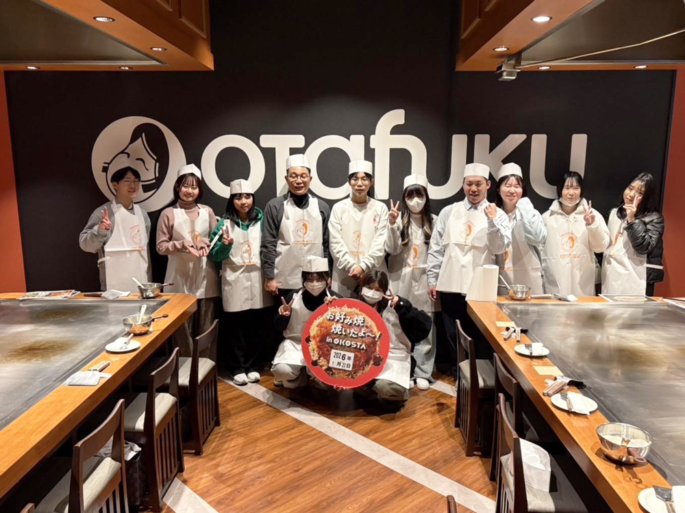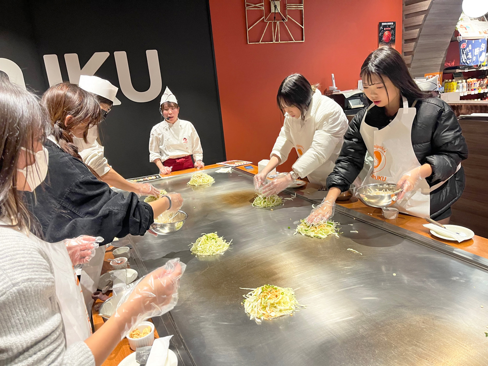 夕方には広島駅の「OKOSTA」でお好み焼きづくりに挑戦し、自分で焼いた一枚を楽しんでいただきました。