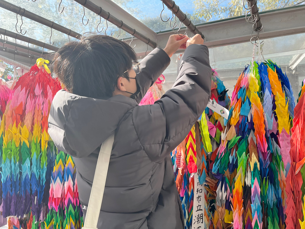 平和記念公園・資料館を訪れ、2日目に作った折り鶴の奉納を行いました。