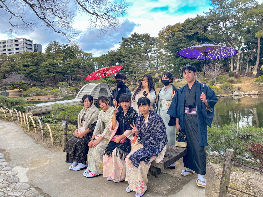 (写真:歓迎セレモニー/着物着付け/縮景園での撮影)